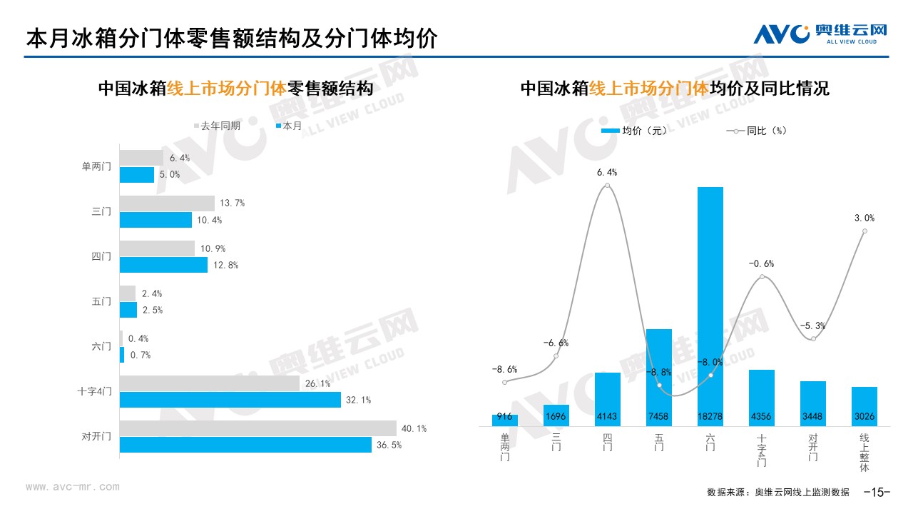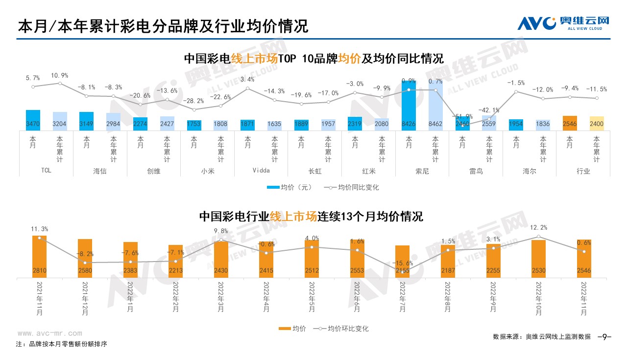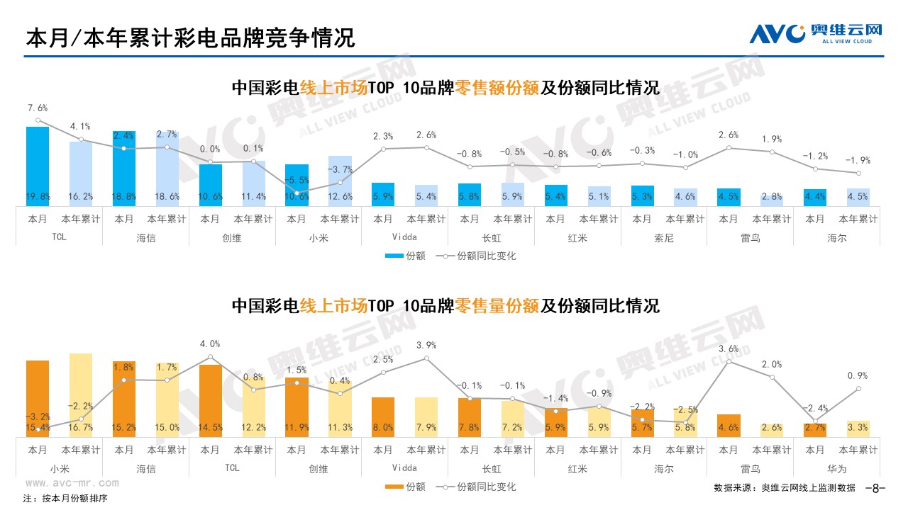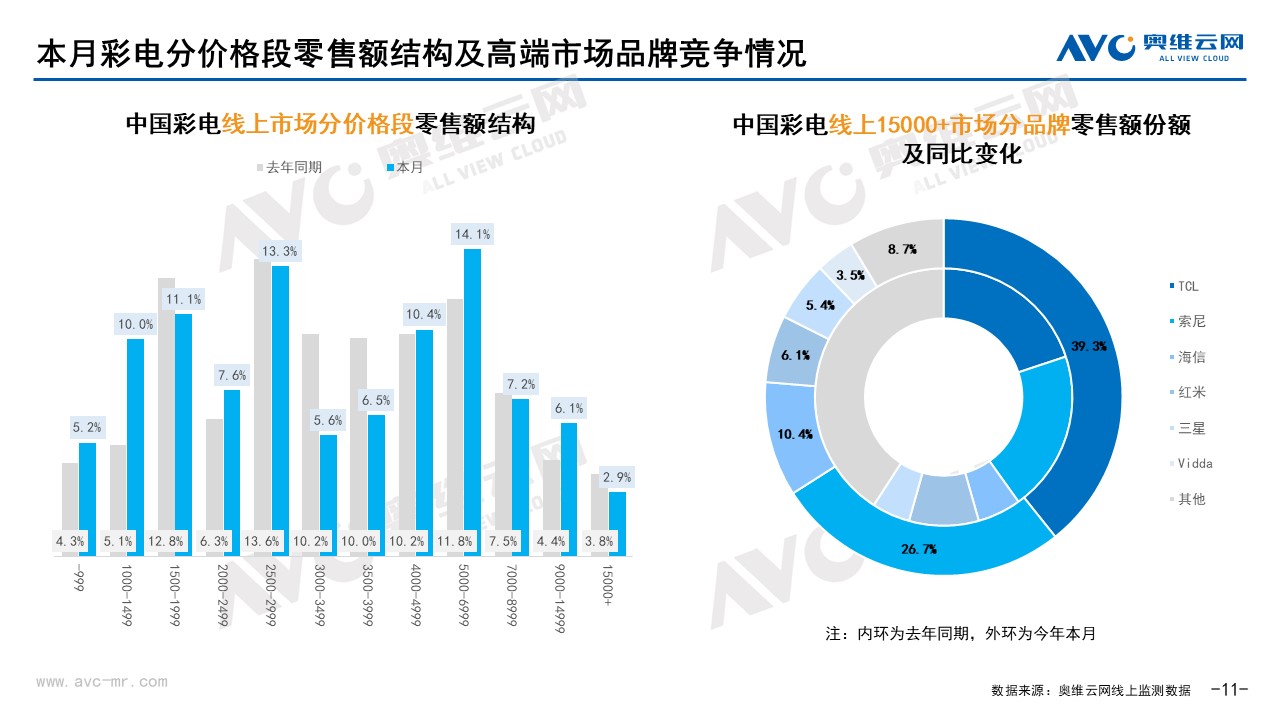 彩电:据奥维云网(AVC)线上市场监测数据显示,本月彩电线上零售额规模同比-22.2%;均价为2546元,同比-9.4%;15000+的彩电零售额占比2.9%,同比-0.9%;不同彩电尺寸中,75寸+彩电零售额占比17.5%,同比8.6%。