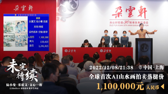 12月8日,在朵云轩拍卖30周年庆典拍卖会上,由百度文心一格续画的民国才女陆小曼未尽稿联同著名海派画家乐震文补全的同名画作《未完•待续》,以110万元落槌成交。由此,全球首次AI山水画作的成功拍卖,展开数字艺术品拍卖的新叙事。