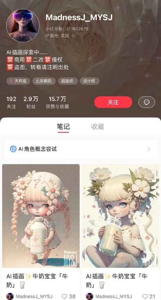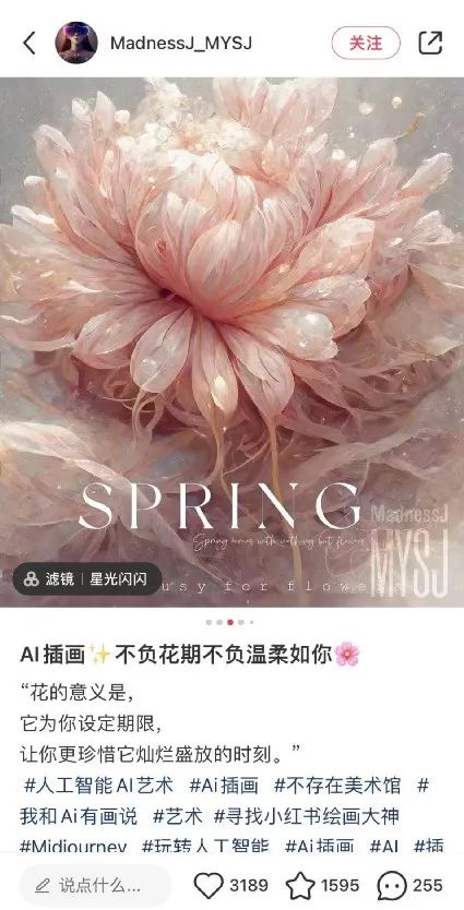 无论是小红书,亦或抖音等社交平台上,AI绘画博主已经在流量KOL群体里拥有一席之地。拥有29000粉丝的小红书博主的主页里,仿佛是一个画廊,每一幅AI画都如梦似幻,而画作下则都是粉丝求原图的留言。一幅怒放的花朵下面,已经有几百条留言希望博主分享原图,这样受欢迎的程度,并不亚于一个手绘插画师。