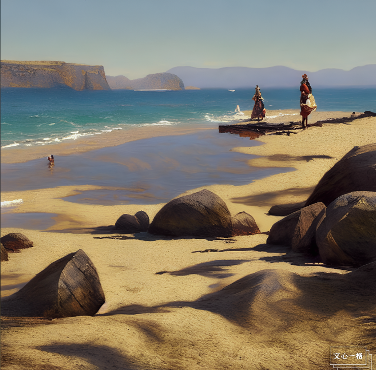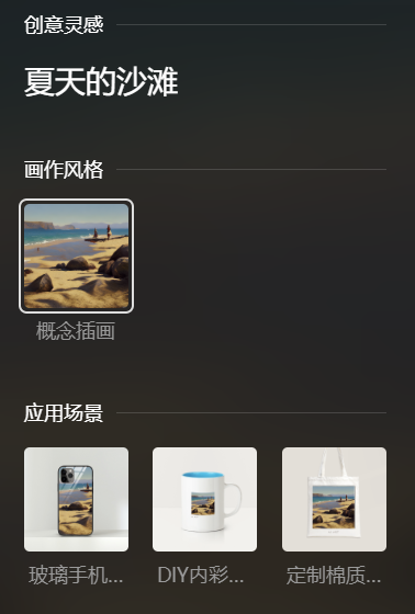 看到生成出的画作时,首先感觉和自己的想象不同,因为本人没有绘画基础,开始联想到的是一幅蓝色大海和黄色沙滩的画作,而AI生成的更为具体,有近景的大石、中景的沙滩、远景的山峦,还有人物点缀在画面中,这幅画更接近一份完整的绘画作品。这幅作品还被设计成不同场景的产品,比如杯子、环保袋等,这也让我们对AI平台未来收入有了更多想象。