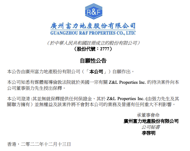 富力地产12月13日早间在港交所公告,公司知悉有媒体报导伦敦法院就于美国一宗有关Z&L Properties Inc.的待决案件向公司董事张力授出保释。公司澄清:其并无就保释提供任何保证金、其于Z&L Properties Inc.(由张力及其关联方拥有)并无权益及该案件将不会对公司的业务及营运有任何重大不利影响。