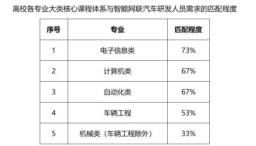 高校各专业大类核心课程体系与智能网联汽车研发人员需求的匹配程度,图片来源:智能网联汽车产业人才需求预测报告