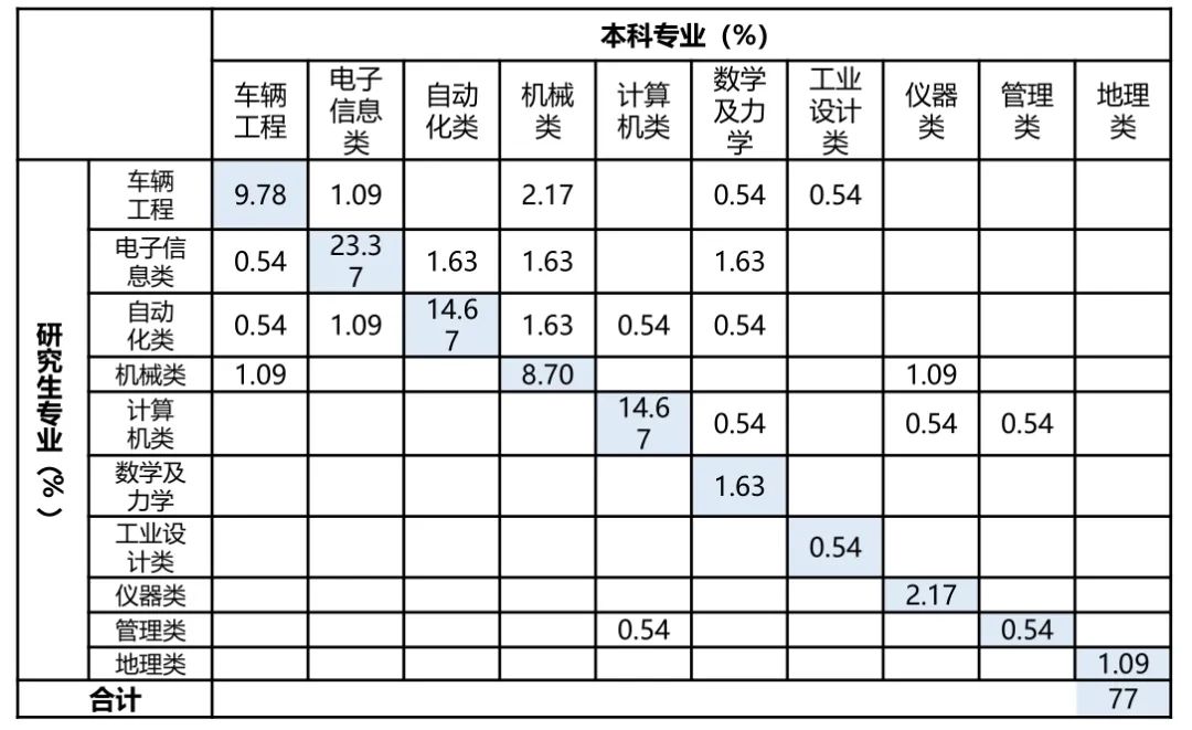 《智能网联汽车产业人才需求预测报告》指出,当前智能网联领域企业现有智能网联研发人员中,超过65%人员的专业背景为非机械类,但本硕同专业的约占77%,具有专业交叉、多学科背景的专业技术人员偏少,“懂汽车+懂IT”的复合型人才极度缺乏。