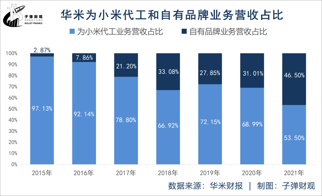 财报显示,在过去的7个年度里,华米自有品牌业务营收占比虽呈总体上升趋势,已由2015年的2.87%增至2021年的46.50%,但大部分营收仍来自于其为小米代工的业务。