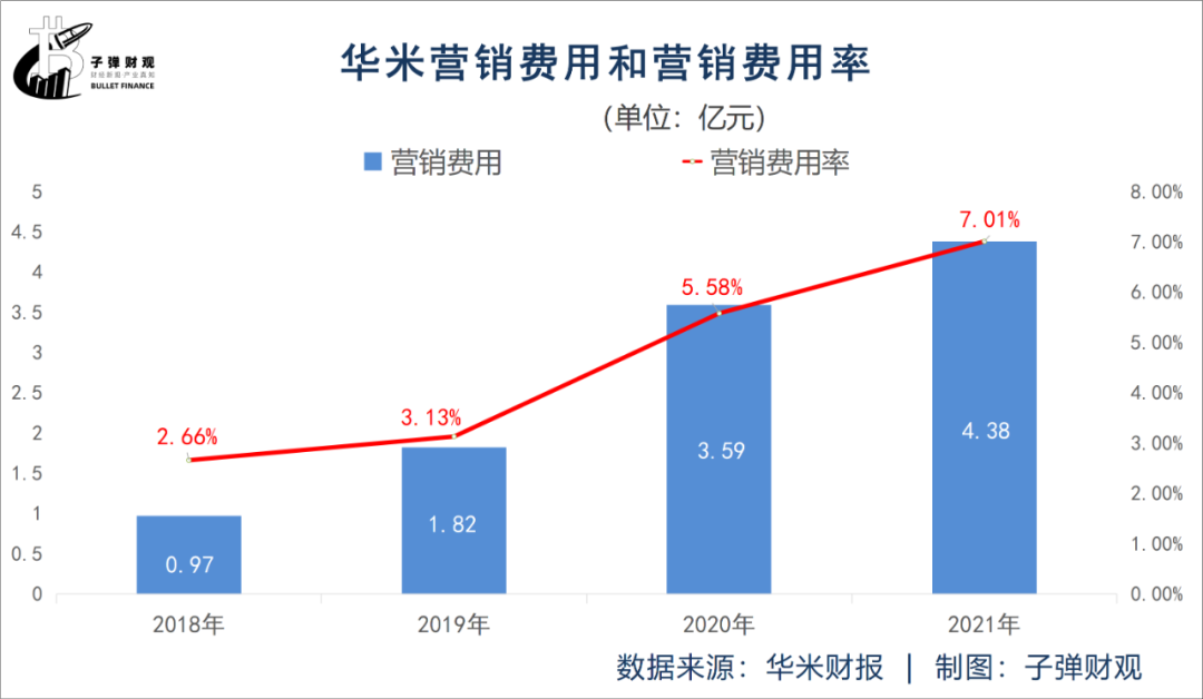 反映在财务数据上,则是华米营销费用的增高。根据财报,最近4个年度,该公司的营销费用依次为0.97亿元、1.82亿元、3.59亿元和4.38亿元。