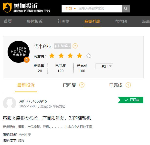 而且,在黑猫投诉平台上,涉及华米的投诉合计达120条,而网友们对华米的投诉除了产品质量差,还涉及售后服务差、虚假宣传及不发货等。