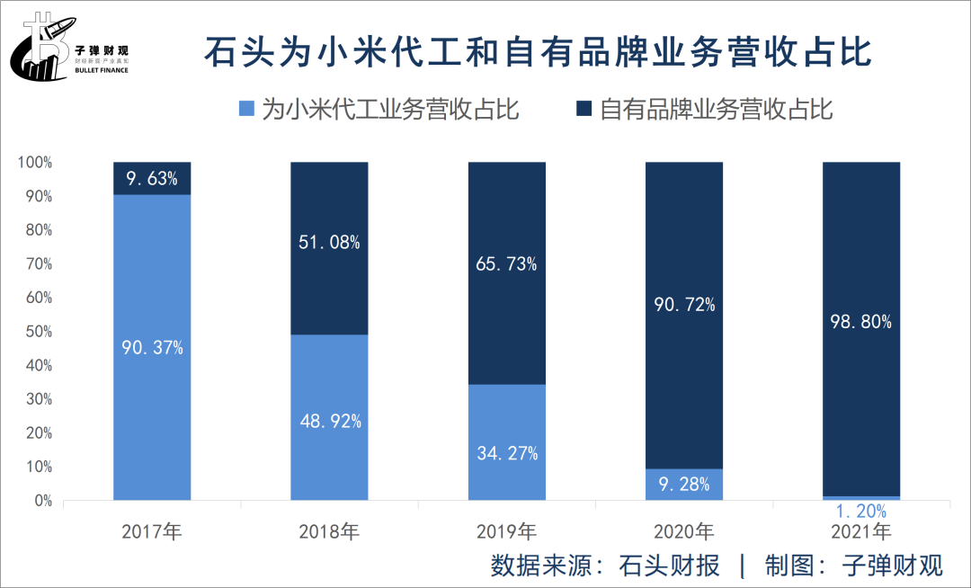 要知道,比华米晚两年“去小米化”的石头在去年已实现了独立。根据石头往期财报,该公司自有品牌业务营收占比已从2017年的9.63%升至2021年的98.80%。很明显,石头完全摆脱了对小米营收的依赖。