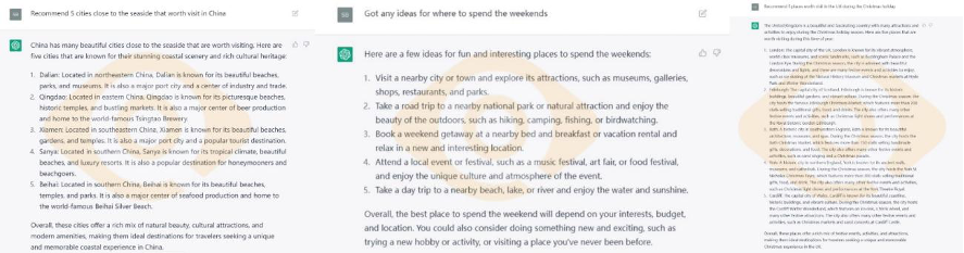 有趣的是,最近大家都在担忧谷歌会不会被ChatGPT替代掉的问题。关于这个问题,我们先来看一个应用场景:我从旅游景点推荐的方向,分别问了ChatGPT这样几个问题,它给出的答案如下: