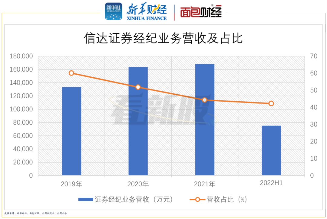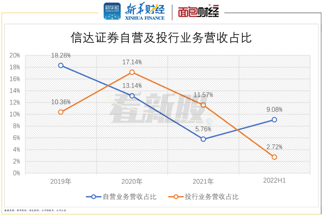 除了证券经纪业务外,自营及投行业务也是信达证券的主要业务,但2022上半年这两项业务的营收占比下降明显。