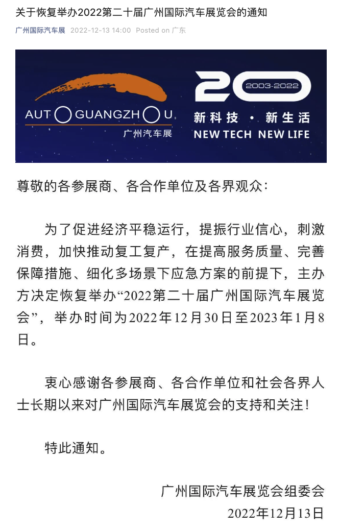 12月13日,广州国际汽车展览会组委会发布公告称,主办方决定恢复举办“2022第二十届广州国际汽车展览会”,举办时间为2022年12月30日至2023年1月8日。