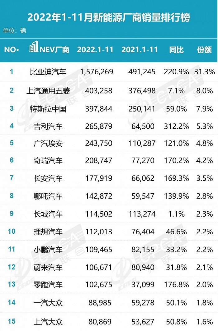 2022年1-11月新能源厂商销量排行榜,图/乘联会微信公众号