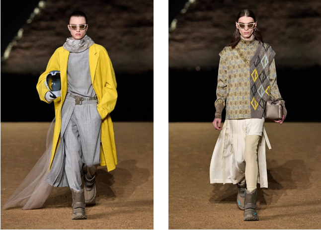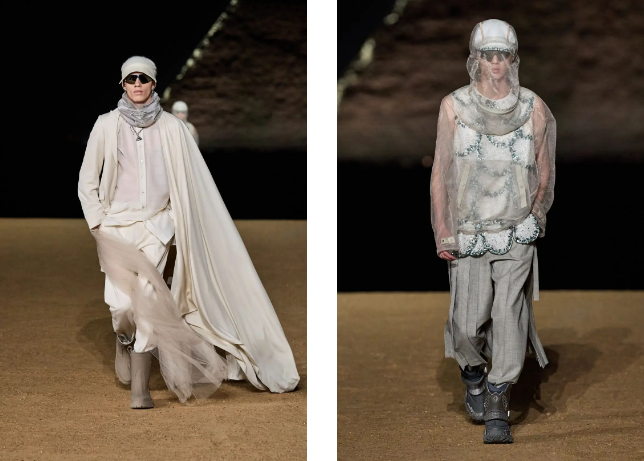 大秀开始,一位模特身着仿佛能在月球行走的太空靴,手中抱着富有赛博科技感的头盔,戴着墨镜,仿佛是科幻片中的星球勘探队员,辉映日落,月落星夜,置身于秀场中,这个造型不难让人想起经典科幻小说《沙丘》里的角色。