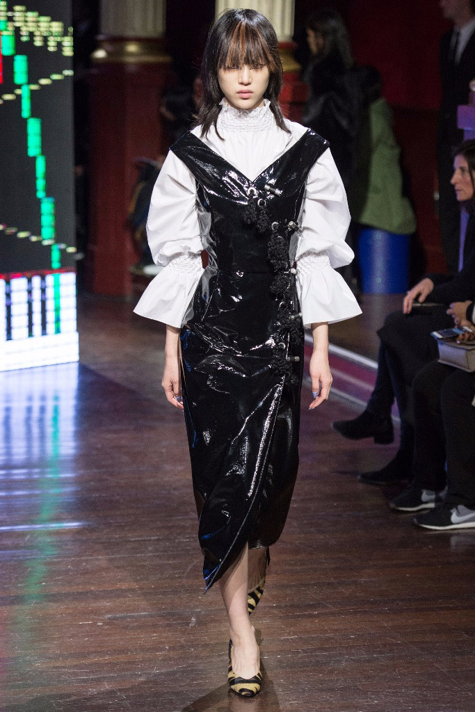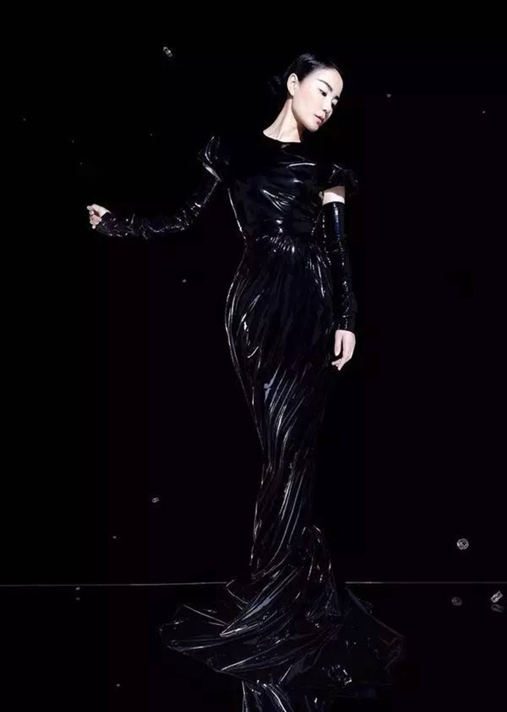 回到海报本身,我们可以看到,一条亮光的黑色PVC长裙将王菲纤细修长的身躯包裹住,裙摆围绕,非常的高贵且神秘。哪怕背景被修成了黑色,你依旧能感觉到衣服带有亮眼的光泽,犹如镜面一般(突然想起了iPhone7)。能给服装本身带来无限动感的感光布料的普遍流行,PVC以其防水和光泽度超高的优势占领秋冬的大部分秀场。
