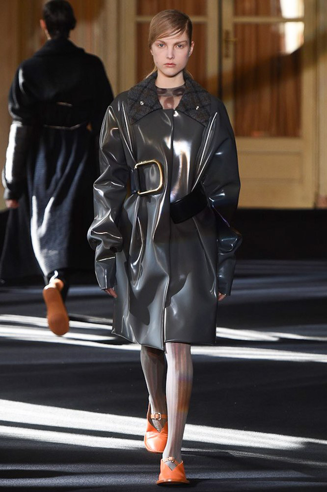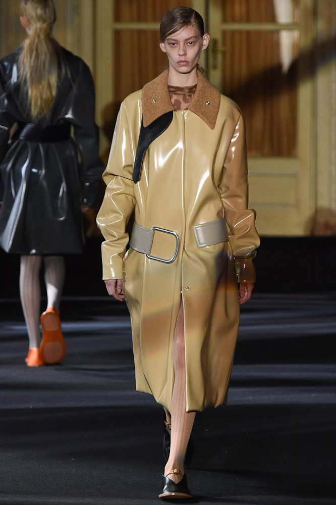 PVC用在大衣身上大概是最常规却又最亮眼的存在,在普遍都用惯了呢子料的情况下,PVC显得更加的提神醒目,且很利落。我们不难发现,呢子料虽然保暖,但在色系上总感觉有些“灰”,而同样是藏肉神器的PVC大衣,在显色上更加高度的还原了真实的色系,且不同角度的带着光泽感的视觉效果,让人很难不注意到你。