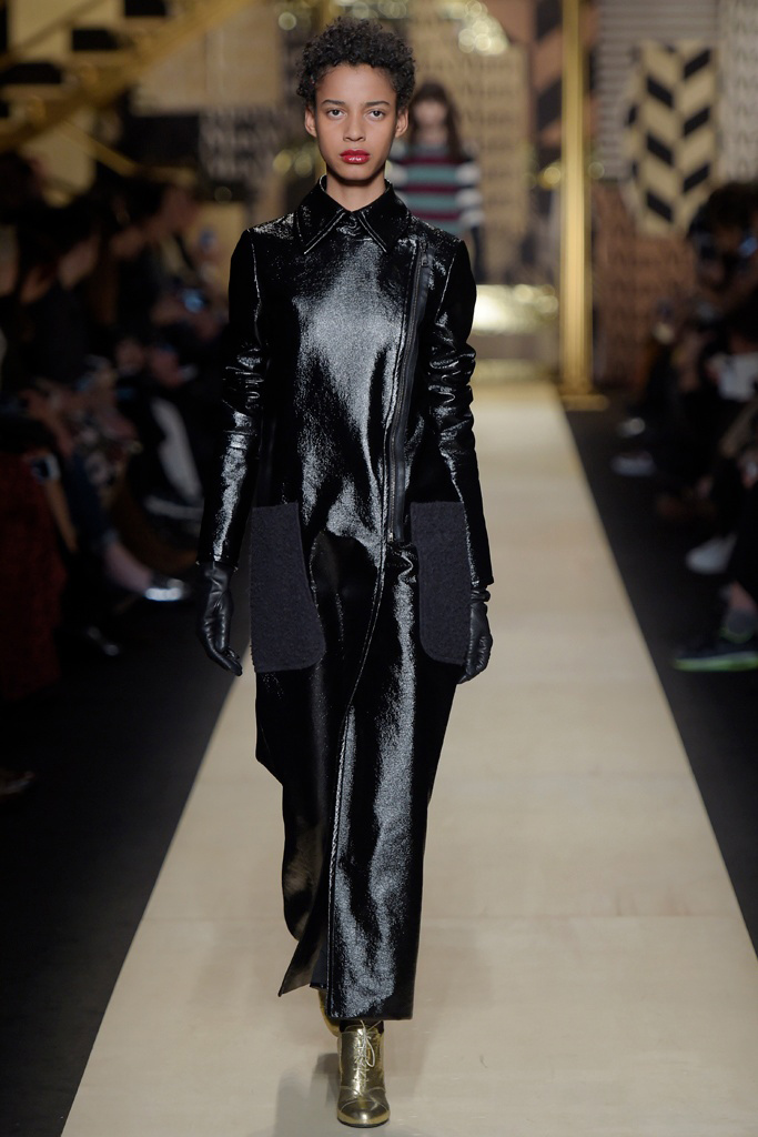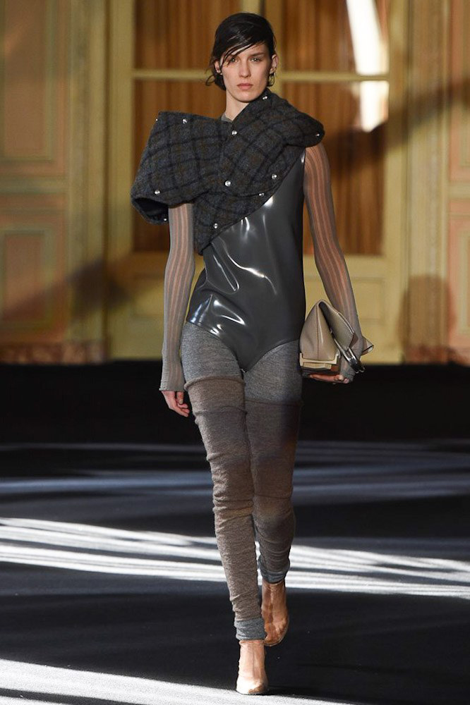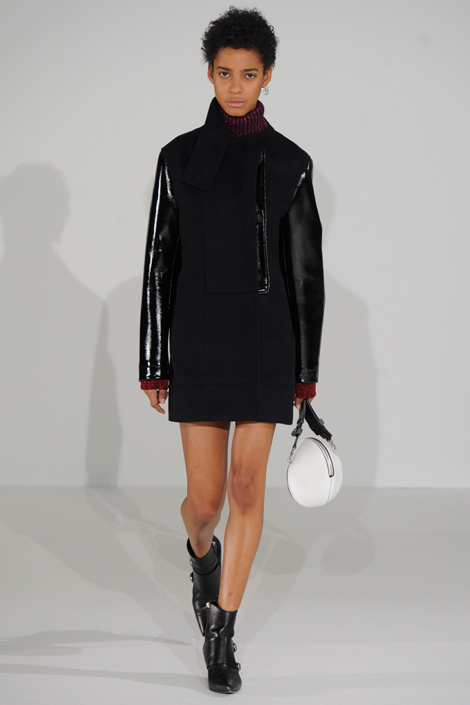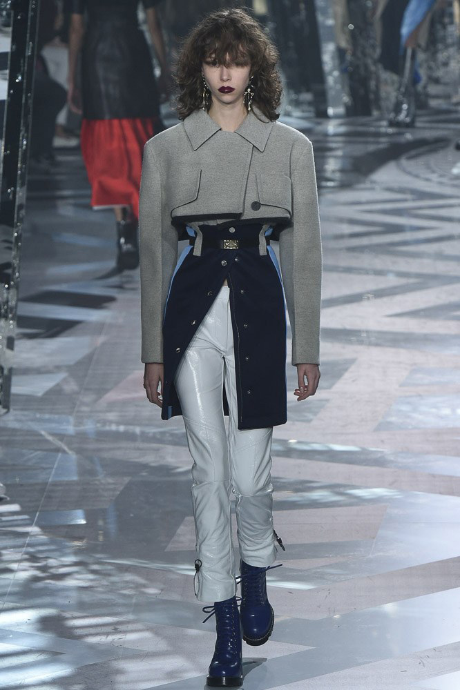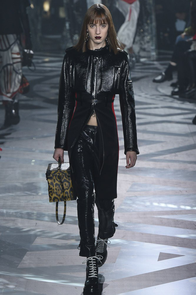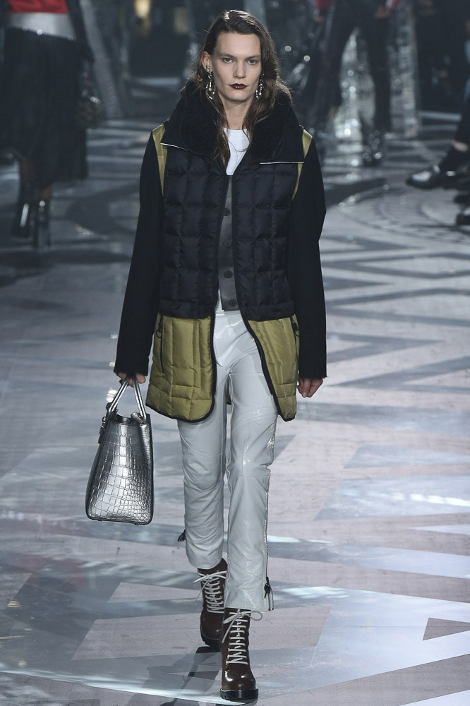 与其他材质拼接过后的PVC同样还是占主导地位,没办法,无论如何你都不能忽视它漂亮的光泽感。高级的灰色调映衬在PVC上带着颇为柔和的光泽,成套穿觉得太过头的话不妨将它们拆分开来,你会发现单独穿着的上衣或是外套非常好搭。