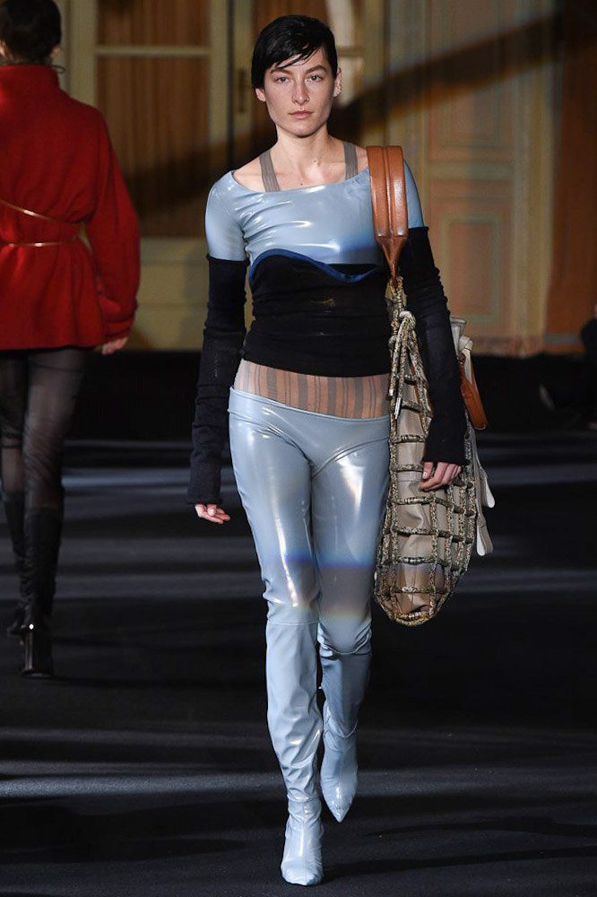 PVC除了简约的色系,也可以做成丰富的模样,前阵子被Kendall穿火了的Bodysuit,一直延续到秋冬季,用PVC做成的Bodysuit相较于普通的材质来说稍微宽松一些,没有那么的无缝贴合。但在下搭了牛仔裤之后,你会被这种带着金属光泽的时髦感所感到眼前一亮,新兴材质虽然被广泛推崇,但它也只出现在很小的配件上,而如今扩大范围做成衣服,它的惊人效果也就被放大了好几倍。