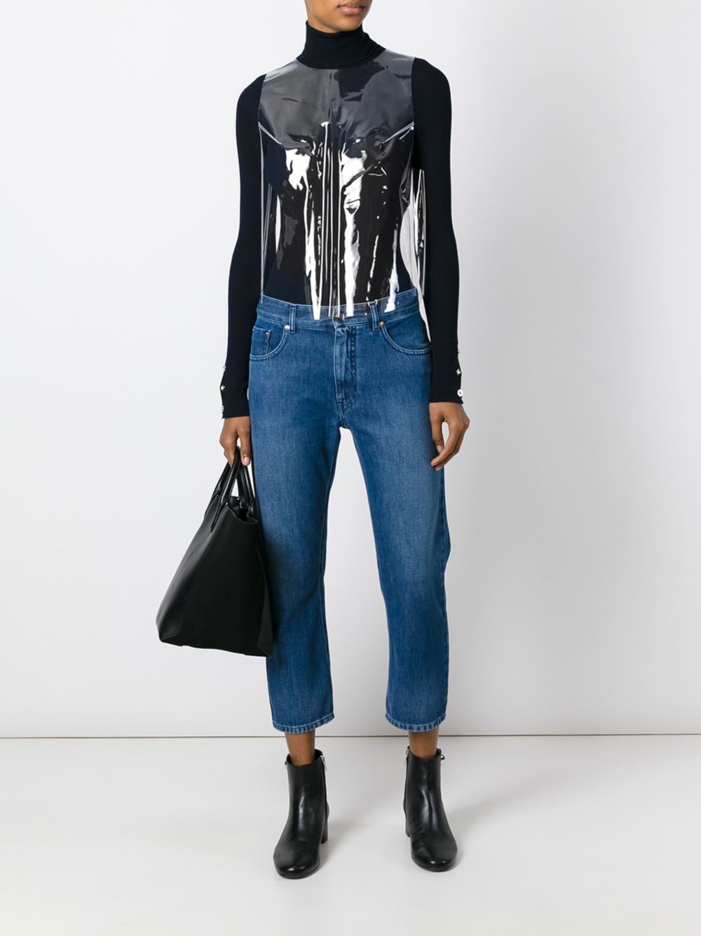 全透明的PVC并不是真的很“透明”,相反的,你会很快注意到它。在黑色打底的对比下,马甲状的透明PVC带来非常有趣的感觉,有点类似于我们小时候下雨天会穿的透明的雨衣一样,是充满未来感的时髦单品。