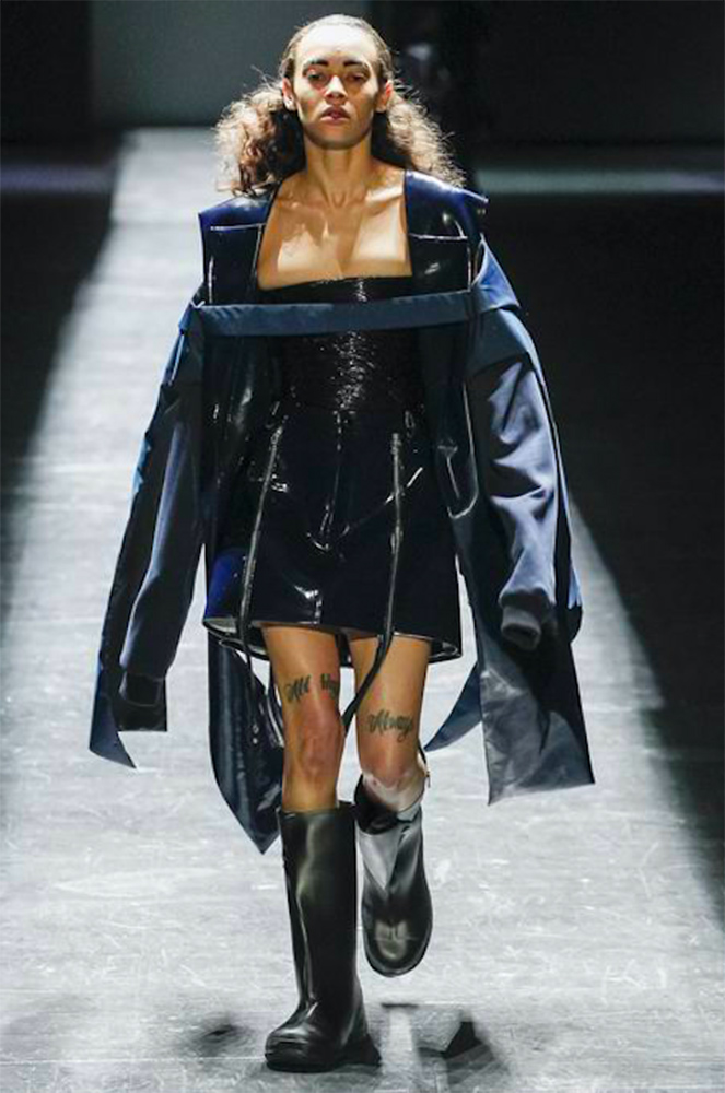 关于衣袖或衣摆可以不做收边处理这一点,或许PVC可以做得很好。没有毛躁的边缘、也不会脱线的特点为制作服装带来了很大的便捷。在尝试这一类服装的时候,其实合身很重要,如何将怪异减弱、而加强日常感的秘诀就在这里。试想一下,如果衣服本身可以称作为“奇怪”,且又宽大拉怂着,那就更奇怪了。可当衣服本身有点奇怪,但却合身且比例舒服时,这些奇怪的感觉或许可以称为“设计感”。