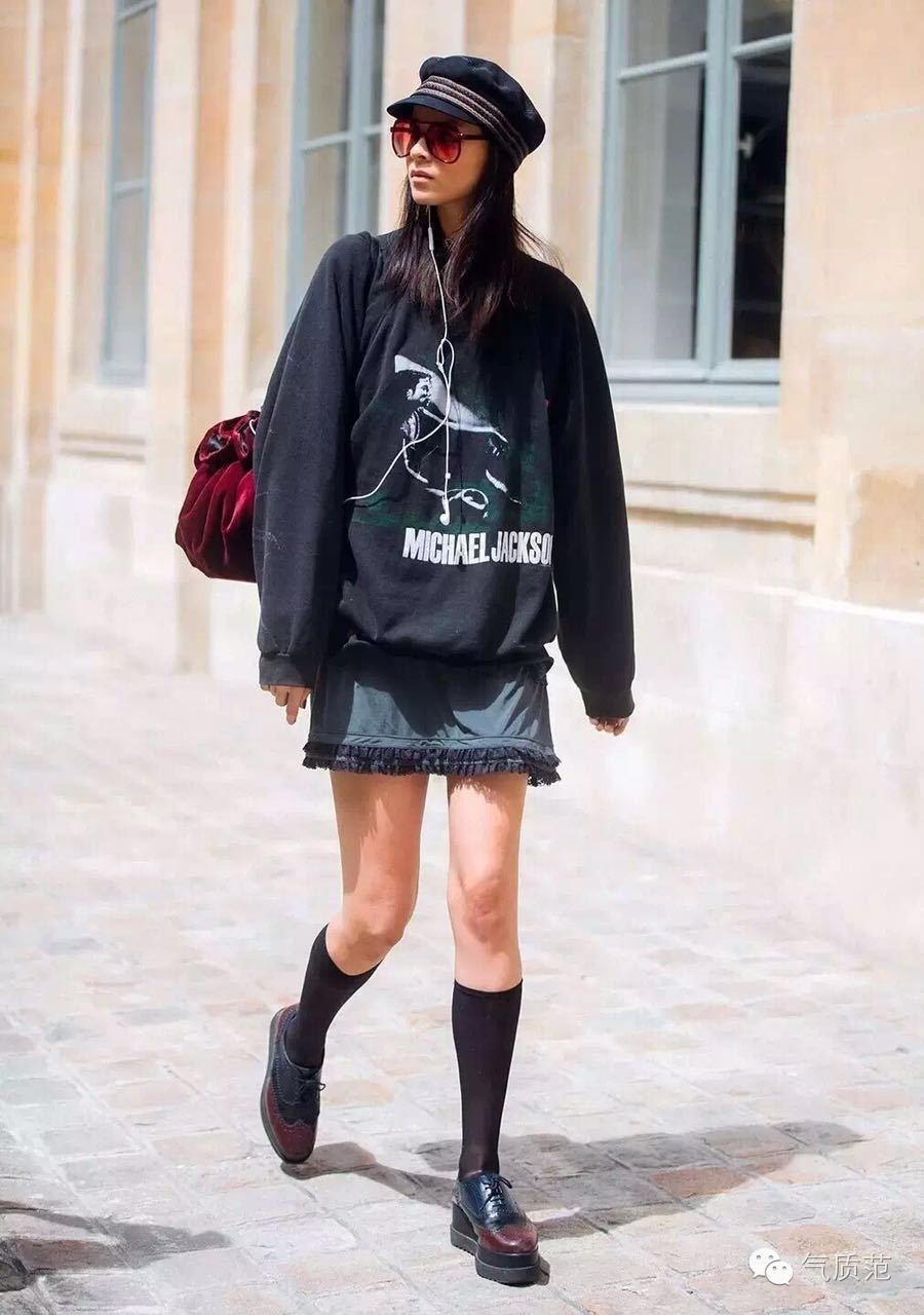 适合还不是很冷的天穿,这种搭法很奇妙,性感和酷感并存。不过记得要把袜子的边缘露出来哦~