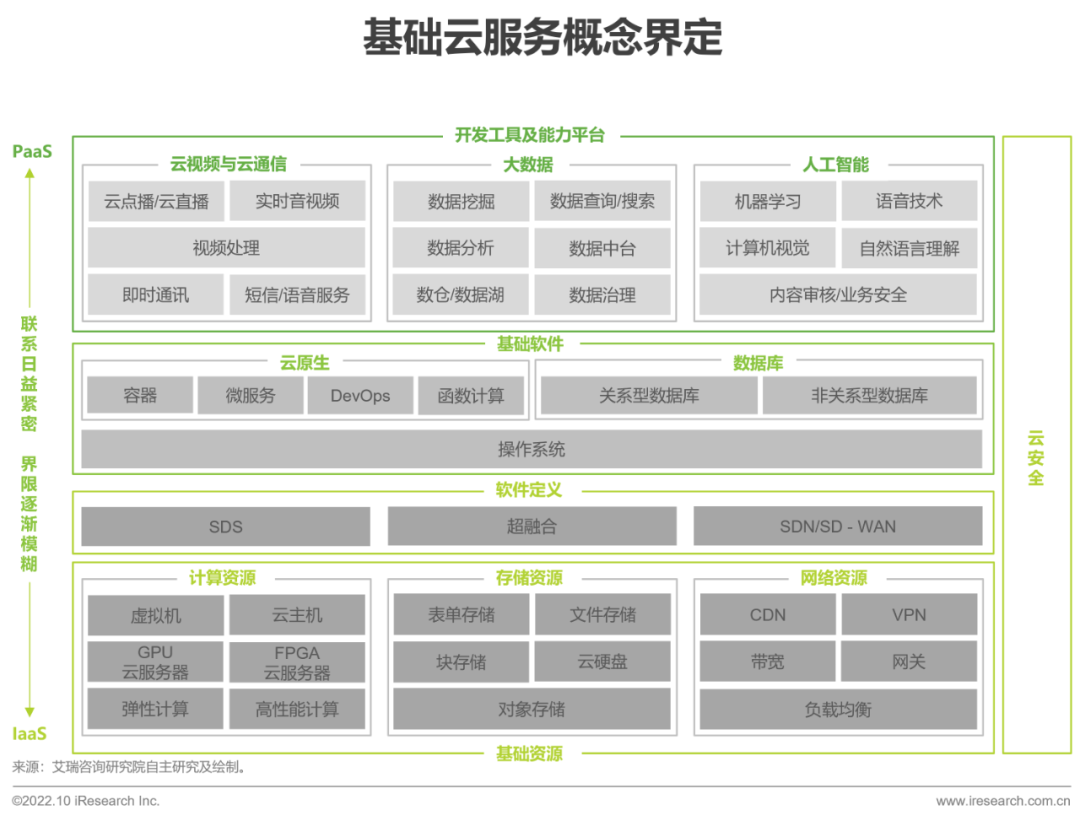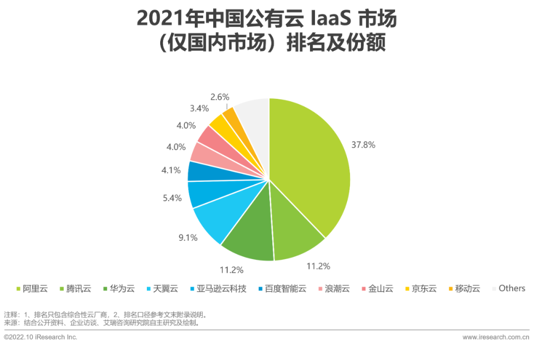 2021年中国整体IaaS市场规模达到2201.4亿元,增速34.3%,PaaS市场规模达到420.7亿元,增速约为55%。在基础云领域,IaaS资源已从云市场的增长动力转变为市场稳定的坚实支撑,成为产业互联网时期的“数字日用品”。整体IaaS市场增速放缓,在于IaaS产品结构的调整,从早期着重在CDN等能提供营收增长的“面子产品”向算力倾斜,以匹配未来数字经济建设更庞大的基础诉求。此外,PaaS市场已逐步成为基础云市场的增长动力。从产品结构看,短期内数据库、大数据仍是PaaS市场增长主导,人工智能贡献较弱。但伴随人工智能与数据能力的更多融合,人工智能产品应用场景的逐步拓展,长期看AI有望成为支持PaaS市场进一步发展的增量因素。