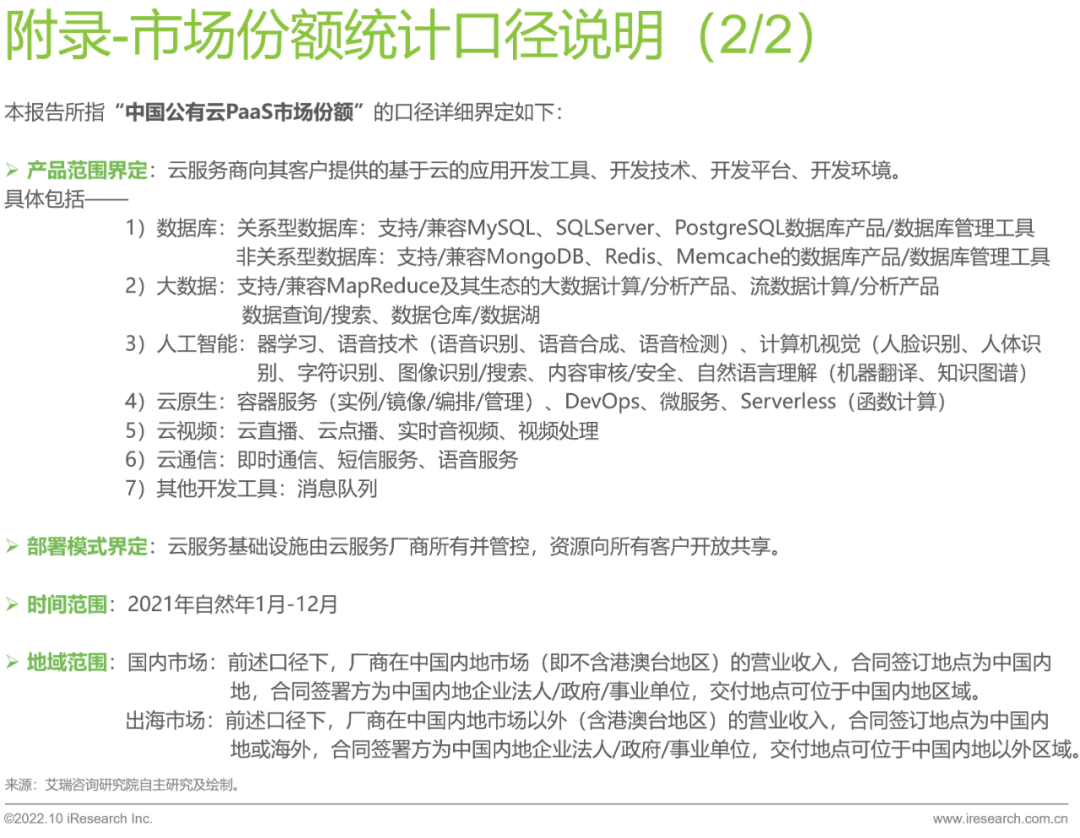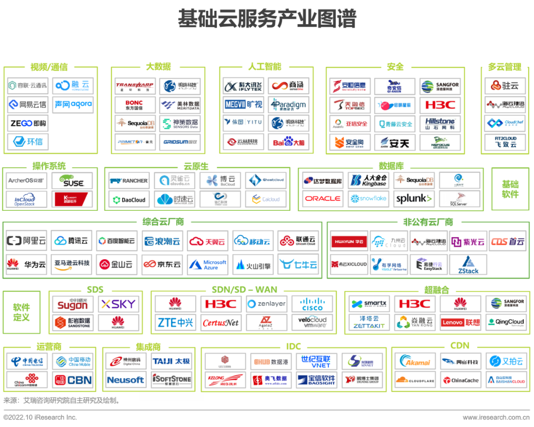 2021年中国公有云IaaS+PaaS市场格局与中国公有云IaaS市场格局类似,阿里云、腾讯云、华为云仍居市场前三。在IaaS+PaaS市场中,互联网背景云厂商(包括中国及海外背景厂商)凭借其在软件领域的优势,相较于公有云IaaS市场,整体份额进一步放大。而ICT、运营商背景云厂商虽然在云资源领域占据举足轻重的位置,但在加入PaaS后,总体份额均不同程度压缩。因此,从基础云总体(IaaS+PaaS)看,PaaS已成为左右市场格局的重要因素。但是,传统行业当前云建设仍以云资源为主。因此,云资源仍是云厂商拓展营收的关键,云能力则是云厂商提升市场表现的重点。成熟行业依托云能力渗透提升云资源转化率,热点行业加速云资源投入规模以构建云能力底座,潜在行业聚拢生态触角为云平台入局做准备,是云厂商在增速上跑赢市场的关键。目前,中国基础云市场中各厂商份额较为固定。虽然行业发展的此起彼伏可能会产生短期的临时份额变化,但只有长期持续的保持高于市场预期的表现才能实现市场位置的调整以及对市场格局的重塑。