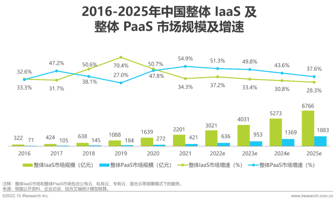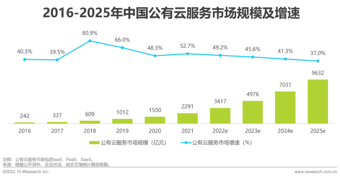 公有云服务市场规模在2021年达到2290.5亿元、增速为52.7%。2021年,中国公有云服务市场虽在后疫情阶段迎来回暖,但宏观发展环境的快速变革亦对公有云服务市场发展造成潜移默化的影响。在基础云领域(IaaS和PaaS),一方面,音视频和文娱内容的行业热度相较于复工复产前略有衰退,另一方面,泛互联网行业的游戏和在线教育产业面临发展转型。受以上因素叠加影响,占据公有云服务市场主体的泛互联网行业在2021年对市场增长贡献有限。在云应用领域(SaaS),虽然SaaS在近几年市场热度高涨,但存在“叫好不叫座”的局面。在复工复产后,由于云应用厂商数量远高于能力,“量变未能达到质变”,市场焦点转向买方市场,多数云应用厂商亦面临潜在生存压力。因此,处在发展“十字路口”的公有云服务行业需积极探寻多条增长路径以实现行业整体稳定高速增长。