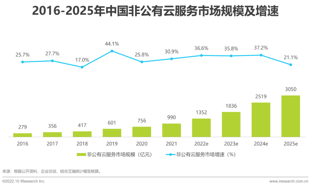 2021年中国非公有云市场规模接近1000亿元,增速为30.9%。从需求侧看,市场增长主要受益于传统行业在数字经济建设及产业数字化提速的背景下开始加速上云,且由于传统行业业务的复杂性,行业监管的严格性,单一公有云的形式并不能满足其业务特性,导致多云共存、跨云管理等将长期成为传统行业上云及用云特征。因此,非公有云中的专属云、混合云、私有云等将成为传统行业上云的长期需求。从供给侧看,提供非公有云服务的厂商也开始逐步转变发展策略:综合云厂商持续增强其非公有云解决方案在技术能力上与公有云的连通性,专业非公有云厂商则将非公有云与更多具体业务场景融合提升其服务的针对性,同时积极提高生态能力强化其方案的适用性。