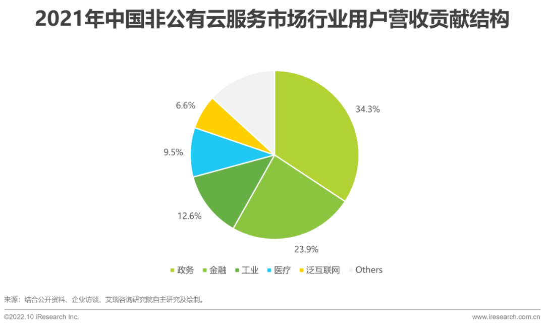 在非公有云领域,政务和金融依旧占据主导地位,两者占比相交往年,政务占比略有下滑,金融占比小幅提升。在2021年政务行业用云规范以及用云模式均有一定调整,导致政务云厂商在提供相关云服务时根据新规则做出必要调整,延缓了部分项目建设,而金融云则较为有效的延续了往年的成熟模式并伴随金融创新的发展而进一步提升市场占比。除了上述行业外,工业制造、医疗等行业亦加大在云领域的支出,但两者的用云动机却略有差异。其中,工业制造,更多是围绕业务需要主动上云,云厂商亦根据其业务场景提供了切实的配套解决方案。目前,工业中的头部企业,更偏向于混合云模式,以实现在公有云能力与私有云管理和安全间的平衡,而行业的中小企业则更多偏向于应用公有云。在医疗行业,地方医联体、医共体加速建设,推进整体医疗行业上云进程,但医疗行业上云更多集中在中小规模医院和区县医院,更多以满足政策要求的被动上云,大型综合医院上云场景仍然有限。因此,非公有云市场未来的发展,一方面需要具备更好的随机应变的能力,另一方面也需要思考传统行业用户上云痛点,以实现“化被动为主动”。