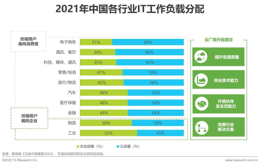 云计算虽然是面向“B端”提供产品与服务,但从行业终端用户类型角度,云计算在“B2B2C”相关行业渗透率较高,但在更为传统的“B2B2B”行业渗透较为缓慢,仍具有较强的“C端”特征。当前,稳中求进的传统行业更多扮演“数字化追赶者”的角色,为了适应宏观环境变化,传统行业不得不“跳级发展”或“选择性发展”往往底层设施还处在信息化阶段,但顶层业务却不得不先进行数字化;或者底层数字化改造逐步完成,但顶层应用却仍未充分普及数字化能力,底层与顶层间存在错位进而影响用云效果。其次,由于传统行业的终端客户更偏向于企业,客户的“数量规模”不如消费者群体广泛,但业务场景关联性强、业务内容复杂。因此,相较于希望通过云计算解决“流量问题”,传统行业客户更注重利用云计算解决“质量问题”。综上,云厂商想更好地向传统行业渗透,首先要构建更高质量的基础资源底座,并提升“数智技术”能力。其次要提升生态伙伴技术能力,综合完善传统行业解决方案的实践性。