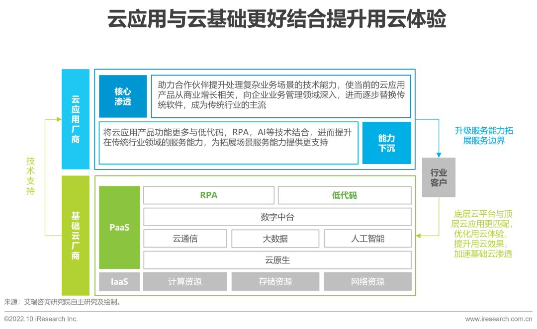 为加快数字化转型步伐,传统行业中大型企业多倾向于优先将应用层上云,后续逐步完善基础云底座。因此,云应用厂商多成为云服务向传统行业渗透的起点,也成为基础云服务触达传统行业的客户的重要渠道。目前,云应用厂商在处理传统行业复杂业务场景和多场景协同上存在能力局限,更多服务于传统行业客户前端业务场景,较难向企业运营管理等核心场景渗透,导致云应用与基础云平台存在“缝隙”,影响云服务在传统行业实施效果。因此,云厂商需要帮助伙伴实现应用层能力的下沉,更好地将PaaS能力输出给伙伴,使其融入云应用产品,逐步完善应用层和基础层的连接,进而提升云服务在传统行业实施的整体性效果。