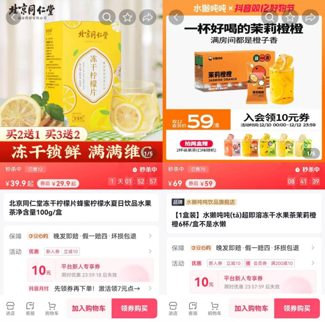 冻干水果茶的优势在于打破了消费场景的限制,即使价格稍贵,但仍赢得了部分消费者青睐。比如在抖音平台上,100g的北京同仁堂冻干柠檬片售价为39.9元,6杯水獭吨吨出品的超即溶冻水果茶“茉莉橙橙”售价为69元。