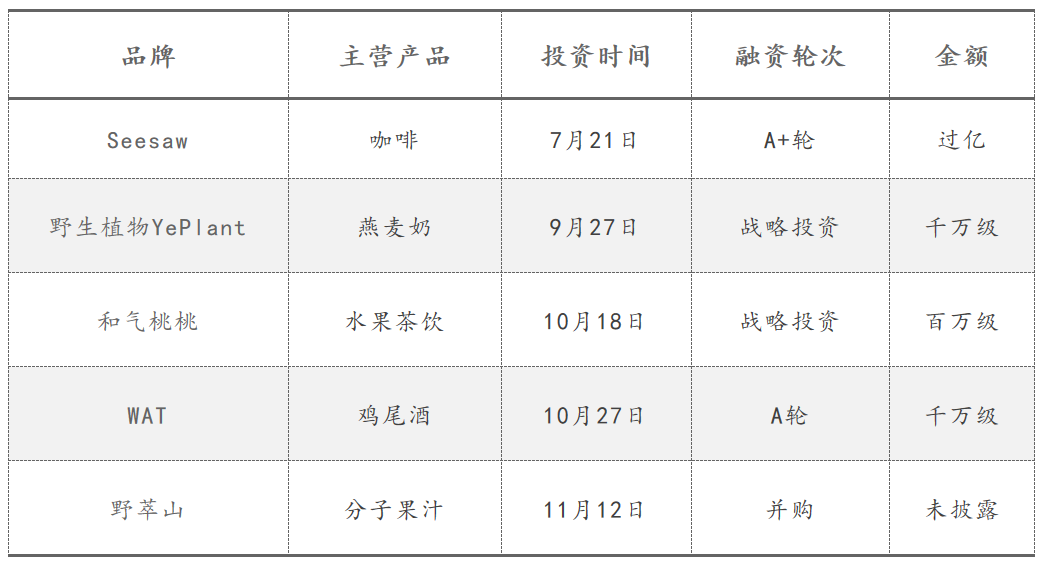 值得关注的是,早在去年下半年,新茶饮品牌们就已开始充当起了“VC”的角色。其中,喜茶先后投资咖啡品牌Seesaw、植物基品牌野生植物Ye Plant、预调酒饮品牌WAT鸡尾酒、茶饮品牌和気桃桃和野萃山分子果汁。