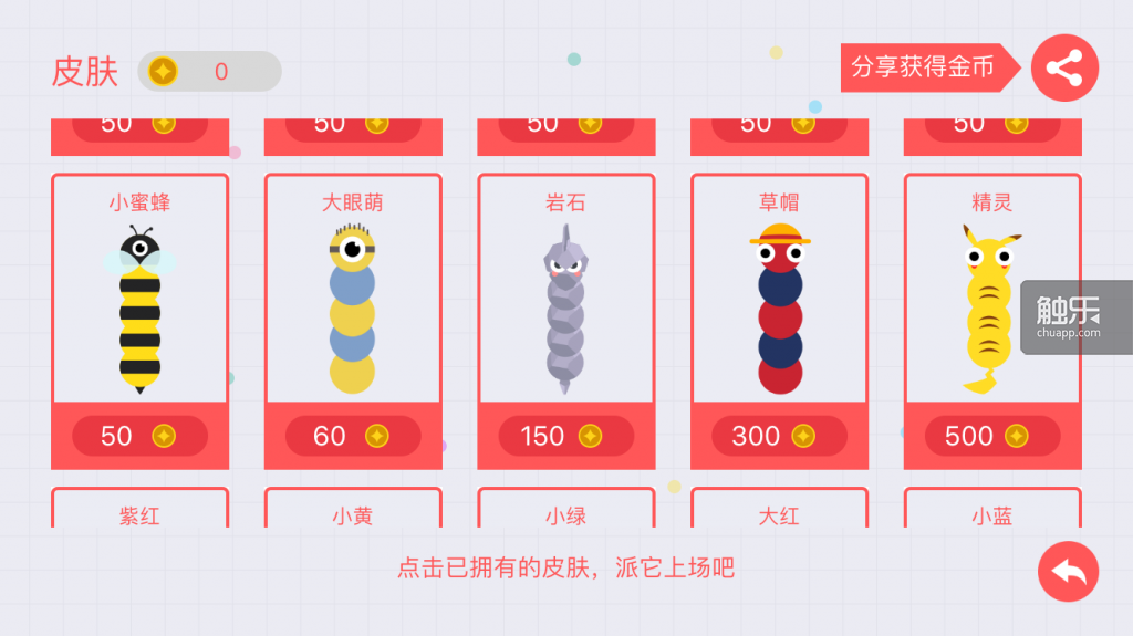 我们非常紧跟时事,比如说当时《宠物小精灵》比较火,我们上皮肤就上小精灵的,皮卡丘啊,其他的小精灵,让玩家有目标。得到这些皮肤必需靠分享传播,你想得到这些皮肤吗?你就要分享。要不断分享不断分享,所以我们的用户越来越多。