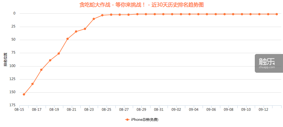 (《贪吃蛇大作战》30天以来的App Store免费榜排名趋势,数据来源于应用雷达)