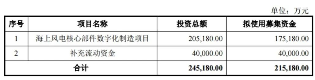华夏风电(公众号hxfd3060)获悉,12月12日,金雷科技股份公司(简称“金雷股份”,SZ:300443)发布《向特定对象发行股票募集说明书》(修订稿),拟募集资金21.52亿元,用于海上风电核心部件数字化制造项目(17.52亿元)和补充流动资金(4亿元)。