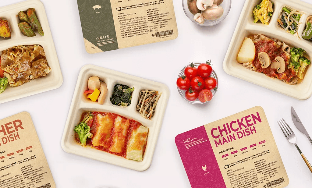 针对这个难题,日本主营外带轻便健康便当的Nosh公司将纸模容器和纸材料贴纸相结合的材料用于冷冻和加热食品的包装,使得更新后的包装在内容物相同的情况下体积更小。