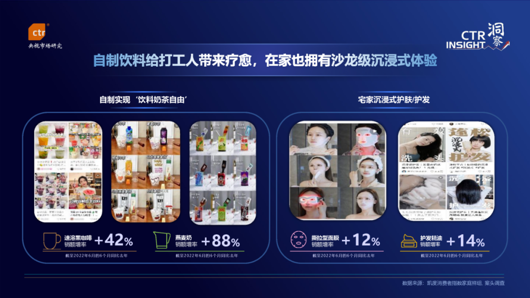 根据英敏特的《2022全球消费者趋势》,食品饮料的三大趋势之一是自在享乐。而居家场景下DIY饮料无疑成为疗愈消费者的重要手段,既能满足消费者想动手的情感诉求,而且并不费心力。在CTR的《2022中国消费市场趋势》也表明,自制饮料能提供疗愈功能,截至2022年6月,速溶黑咖啡和燕麦奶的销额增率同比增长了42%和88%,这意味着消费者对于DIY饮料的乐趣只增不减。