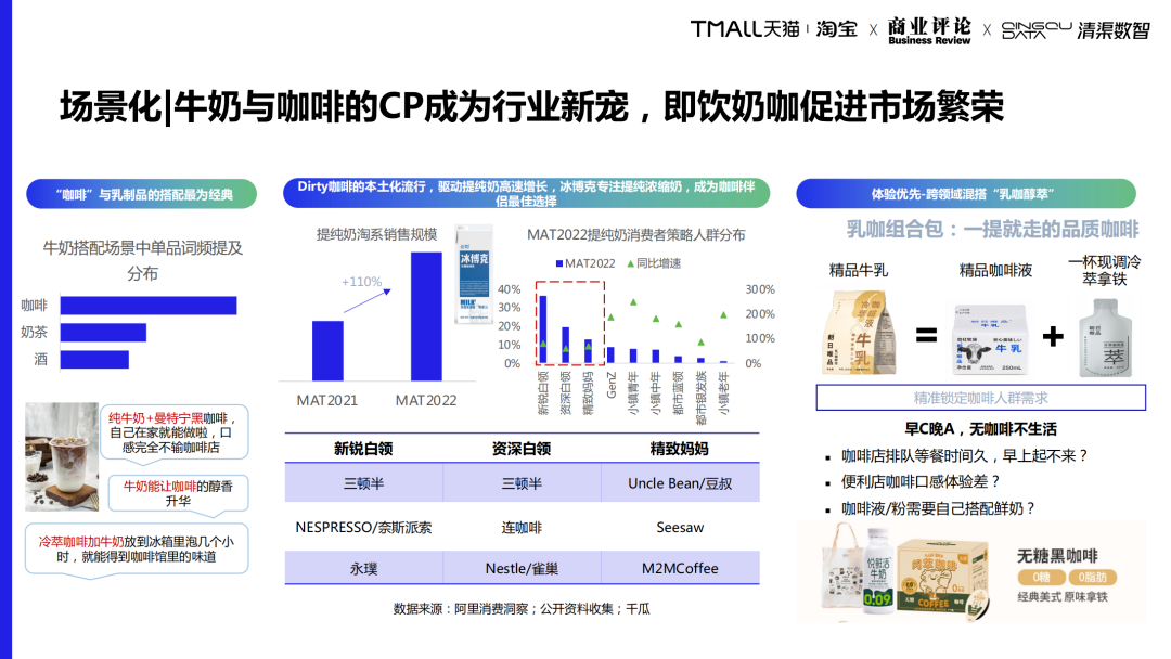 在咖啡的搭配场景中牛奶是提及频率较高的单品词,咖啡和乳制品是非常经典的搭配。此外,dirty咖啡的本土化流行也驱动着提纯奶市场的高速增长,在淘系平台上,提纯奶在2022年实现了同比增长110%的增速。