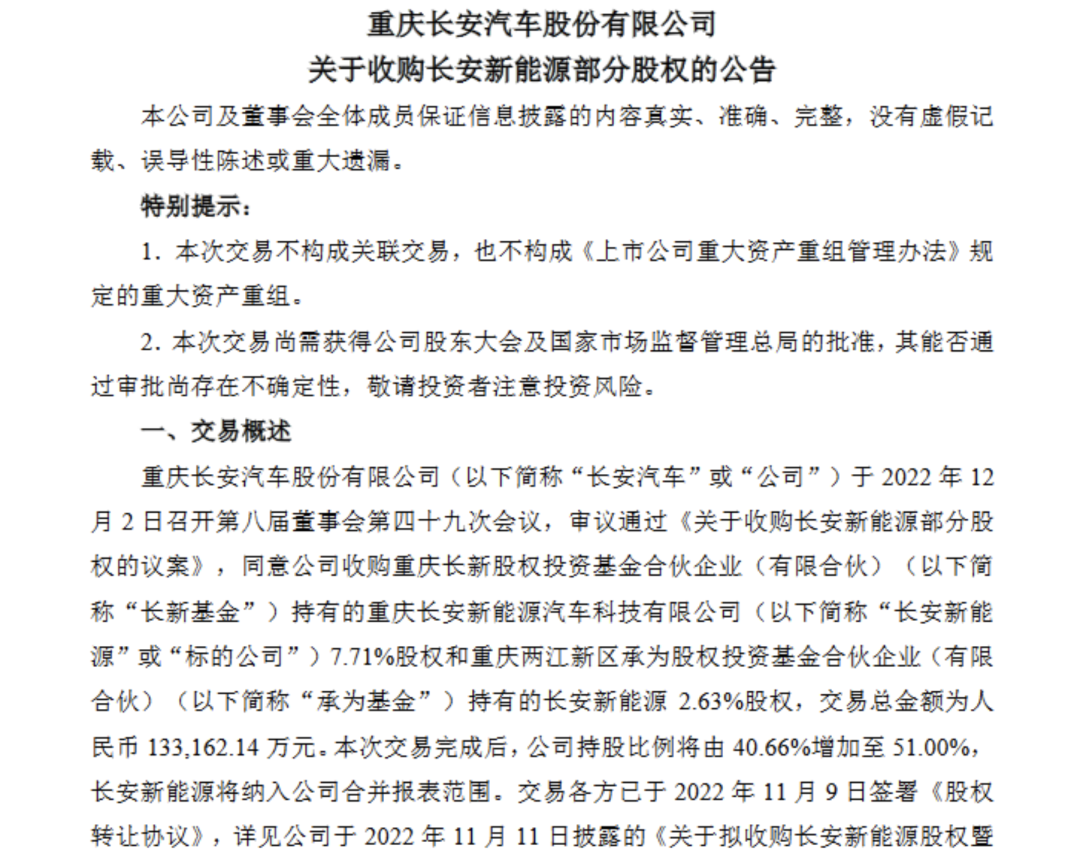 近日,长安发布公告称,公司审议通过了《关于收购长安新能源部分股权的议案》,将以13.32亿元的价格收购长安新能源10.34%股权;本次交易完成后,长安汽车的持股比例将由40.66%增加至51.00%,长安新能源将重新纳入公司合并报表范围。
