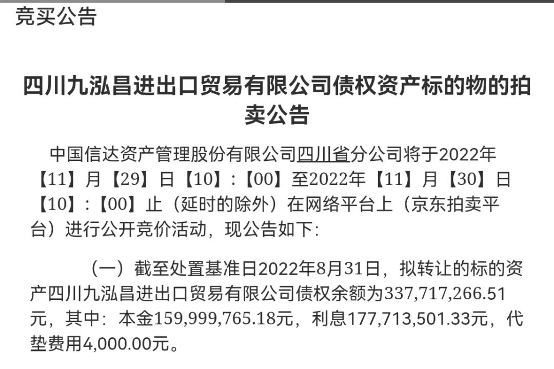 直到今年11月29日,中国信达资产管理股份有限公司四川省分公司在京东拍卖平台上以公开竞价的形式转让四川九泓昌进出口贸易有限公司债权资产,起拍价为2.6198亿元。但到报价截止时间,仍无人出价。