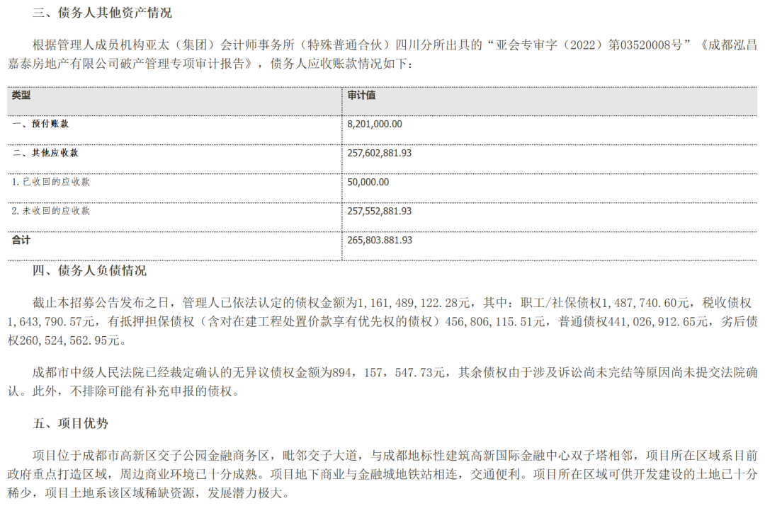 但项目没有再度沉寂,到12月9日,项目再度传来动向:又一次招募重整投资人。此次招募除披露基本信息外,还披露了成都泓昌嘉泰房地产有限公司资产与债务情况,其资产为预付账款820.1万元和未收回的应收款约2.58亿元。