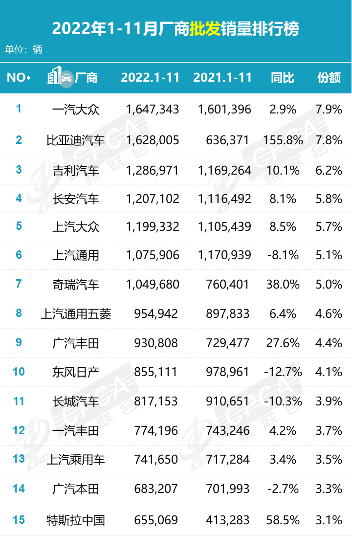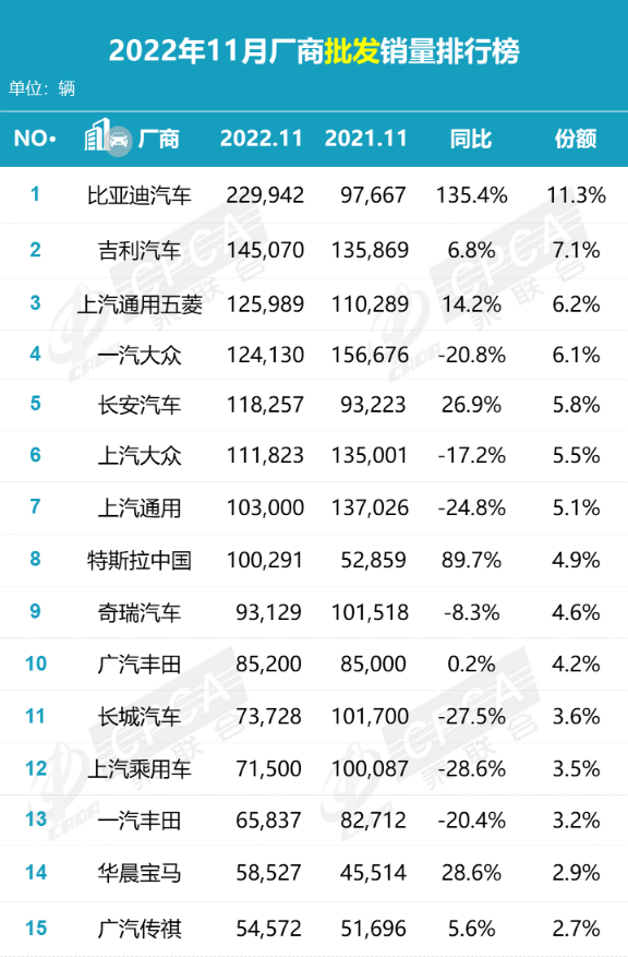 说到这儿大家应该很清楚了吧, 11月整体车市成绩不佳,拖后腿的主要就是那些仍然以销售燃油车为主的合资品牌。对比之下,11月主流合资品牌总共只卖出了54万辆,同比大幅下降31%,环比也下降了23%。就连以往大家心目中最坚挺的日系品牌, 也仅剩广汽丰田获得了3.5%的同比正增长,其余两家本田合资公司,以及日产均掉出乘联会公布的11月车企销量排行版前十五名。