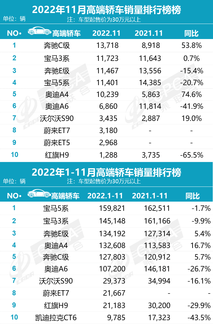 当然除了BBA之外,其它品牌的车型呈现明显的阶梯差。自认为产能爬升后销量能够超越3系的蔚来ET5,11月卖出了2968台,上量指数不如自家高级别车型ET7。另外,红旗H9销量为1288辆,同比大跌65.5%,一方面也受到了同价位新能源车的挤压,另一方面分析可能由于车型长时间没有优化更新,产品竞争力有些掉队。