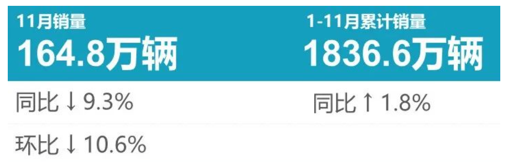 11月的确是传统销售淡季。据乘联会公布的2022年11月乘用车销售数据显示,总共卖出164.9万辆,同比下降9.2%,环比下降10.5%。