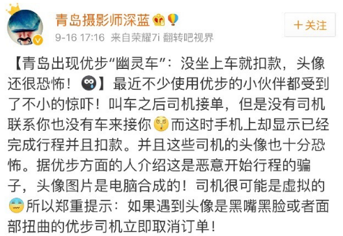 博主@贴吧娘 今天贴了一则青岛都市传说——“优步幽灵车”。这个都市传说先是下面这位博主曝光的:
