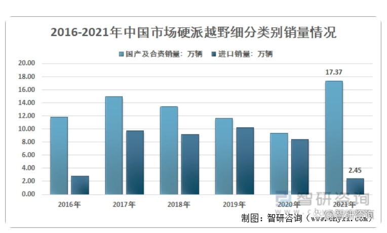 (2016-2021年中国市场硬派越野细分类别销量情况 图源:智研咨询)