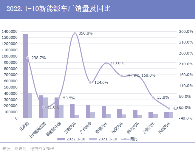 这背后是2021-2022年长城汽车对于KPI的焦虑:根据乘用车市场信息联席会的数据,该公司在2022年1-10月份总共卖出了约10.23万辆新能源汽车,仅比2021年同期增长4.8%。长城汽车从2021年的销量第四直接掉到了第十。