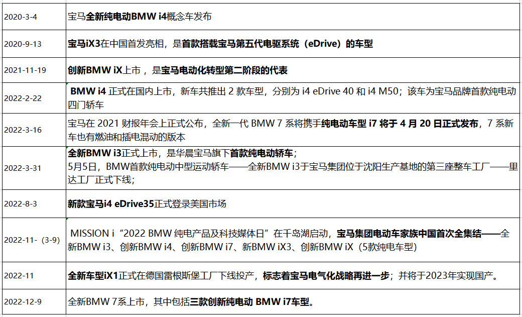 2022年11月3-9日, MISSION i“2022 BMW 纯电产品及科技媒体日”在千岛湖启动,宝马集团电动车家族5款纯电车型——全新BMW i3、创新BMW i4、创新BMW i7、新BMW iX3、创新BMW iX,首次在中国亮相,此外,宝马纯电动摩托车全新BMW CE 04也同场亮相。
