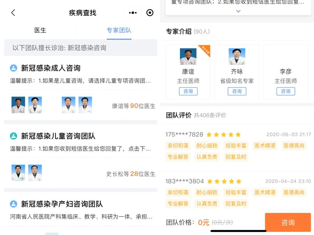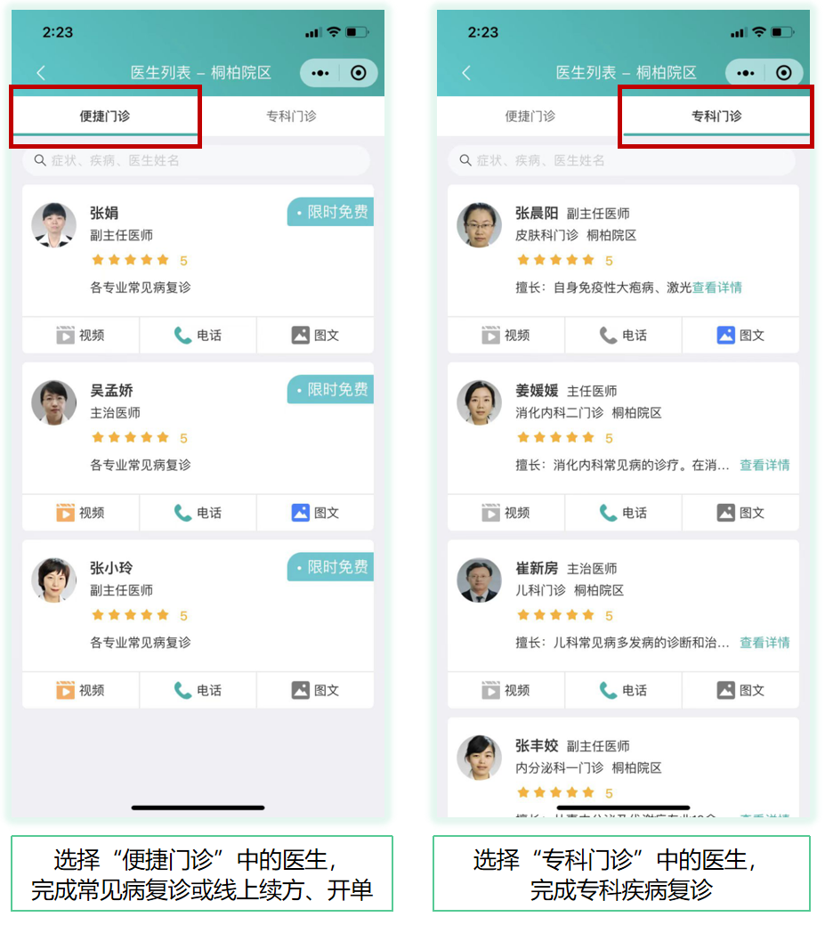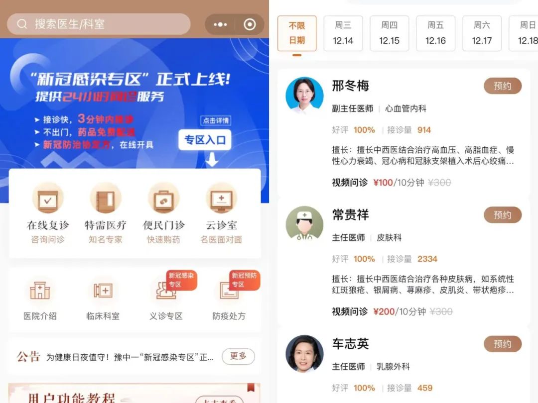 点击抗冠专区、复诊等,选择科室及专家发起预约问诊。