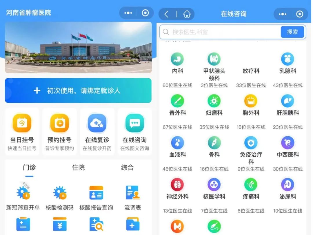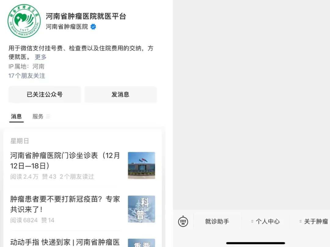 微信关注“河南省肿瘤医院就医平台服务号”→【就诊助手】进入问诊页面。
